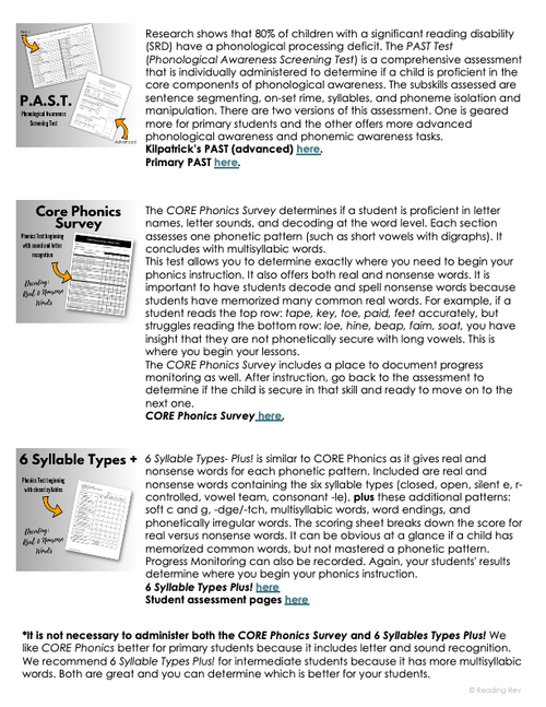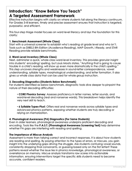 - A step-by-step triage system for assessments (benchmark, word inventory, decoding, phonemic awareness).